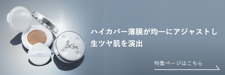 メイクしたての美しさが24時間※1続く『&be ラスティングクッションファンデーション』に続き、ツヤタイプのクッションファンデーションが登場。 特殊な密着ポリマー※2とウォータリーフィルム処方によって、肌に溶け込むように広がり、自然で軽やかな仕上がりを実現しました。 毛穴や色むらをカバーしながら、発光するような透明感※3とツヤをもたらします。 重ねても厚ぼったくならずにカバー力を調整できるため、ナチュラルな仕上がりはもちろん、カバー力を重視される方もお使いいただけます。