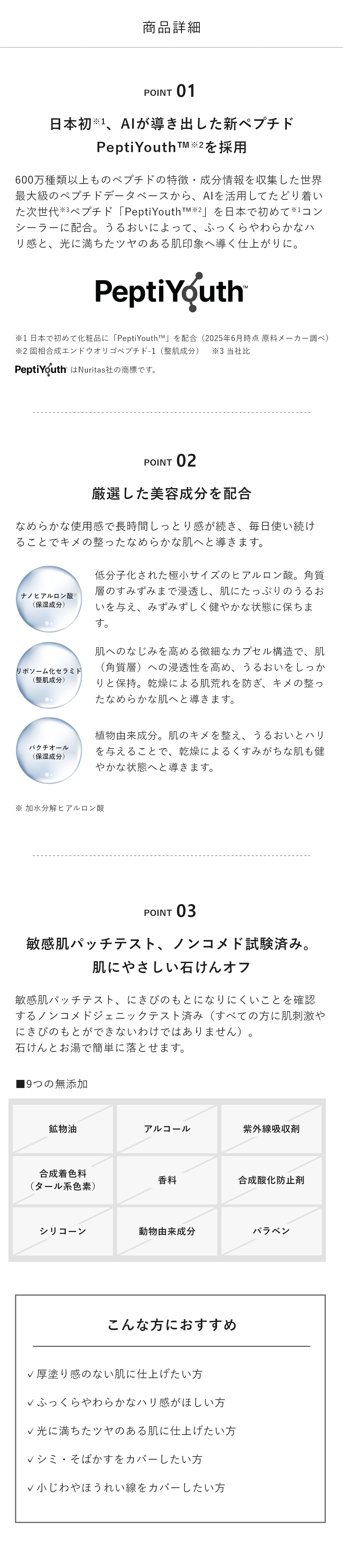 トリエチルヘキサノイン、酸化チタン、ヘキサ(ヒドロキシステアリン酸/ステアリン酸/ロジン酸)ジペンタエリスリチル、シリカ、ヒマワリ種子ロウ、ラウロイルグルタミン酸ジ(フィトステリル/オクチルドデシル)、トリ酢酸テトラステアリン酸スクロース、マイカ、オレイン酸ポリグリセリル-2、セスキオレイン酸ソルビタン、固相合成エンドウオリゴペプチド-1、加水分解ヒアルロン酸、セラミドAG、セラミドAP、セラミドEOP、セラミドNG、セラミドNP、バクチオール、テトラヘキシルデカン酸アスコルビル、ナイアシンアミド、ツボクサ葉エキス、アルギニン、ベタイン、PCA-Na、PCA、セリン、アラニン、グリシン、グルタミン酸、トレオニン、プロリン、リシンHCl、レチノール、ダイズ油、カルボマー、トコフェロール、アルギン酸PG、BG、アラビアゴム、水添レシチン、フィトステロールズ、カルナウバロウ、カプリル酸グリセリル、乳酸Na、水酸化Al、ステアリン酸、アルミナ、水、(+/-)酸化鉄、タルク