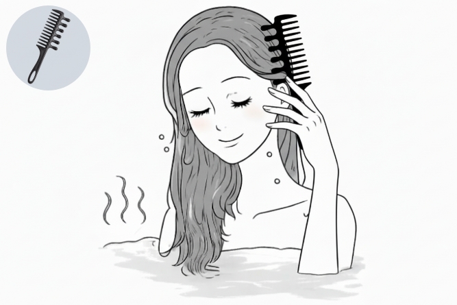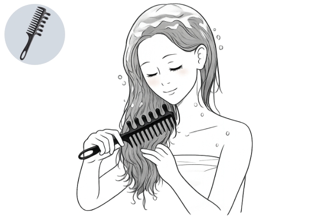 1. シャワー前、髪のもつれを指でほぐしたあと、ブラッシングして不要なほこりをとることでシャンプーの泡立ちがUP!