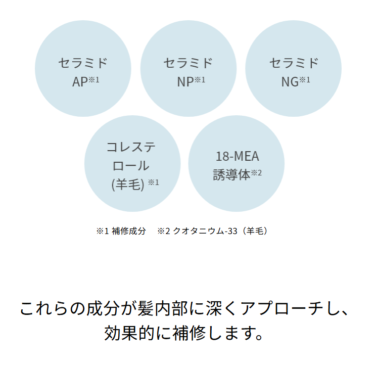 水、DPG、セテアリルアルコール、ジメチコン、アモジメチコン、ベヘニルアルコール、ステアロキシプロピルトリモニウムクロリド、ベヘントリモニウムクロリド、ジフェニルシロキシフェニルトリメチコン、セタノール、ステアリルアルコール、香料、フェノキシエタノール、アミノプロピルジメチコン、イソプロパノール、カエサルピニアスピノサヒドロキシプロピルトリモニウムクロリド、EDTA-2Na、セトリモニウムクロリド、クエン酸、BG、クエン酸Na、バオバブ種子油、アボカド油、アルガニアスピノサ核油、オリーブ果実油、シア脂、ヘキサ(ヒドロキシステアリン酸/ステアリン酸/ロジン酸)ジペンタエリスリチル、ダイマージリノール酸ダイマージリノレイルビス(ベヘニル/イソステアリル/フィトステリル)、セバシン酸ジエチル、メドウフォーム-δ-ラクトン、イソノナン酸イソノニル、ヒドロキシエチルウレア、イソステアロイル加水分解ケラチン(羊毛)、ジラウラミドグルタミドリシンNa、加水分解エンドウタンパク、ステアルジモニウムヒドロキシプロピル加水分解ケラチン(羊毛)、PCA-Na、乳酸Na、アミノエチルチオコハク酸ジアンモニウム、PG、加水分解ケラチン(カシミヤヤギ)、加水分解ゴマタンパクPGプロピルメチルシランジオール、アルギニン、加水分解シルク、アスパラギン酸、PCA、ウメ果実エキス、グリシン、アラニン、ヒアルロン酸ヒドロキシプロピルトリモニウム、セリン、ジステアリルジモニウムクロリド、バリン、γ-ドコサラクトン、トコフェロール、クオタニウム-33(羊毛)、プロリン、トレオニン、イソロイシン、コレステロール(羊毛)、ヒスチジン、フェニルアラニン、セラミドNG、セラミドNP、セラミドAP