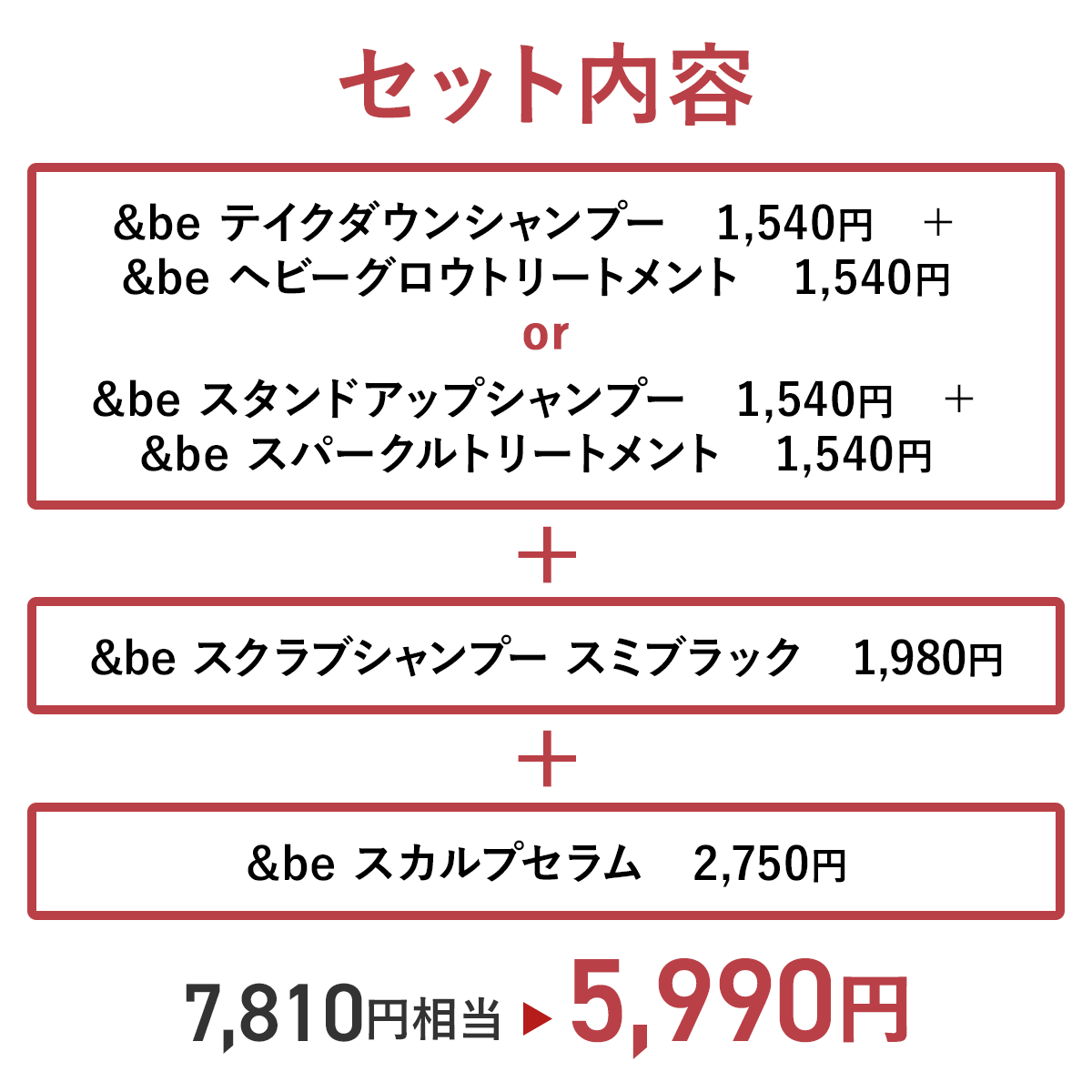 髪質に合わせて選べるシャンプー&トリートメントに、スクラブシャンプーとスカルプセラムを加えた贅沢4点セット。