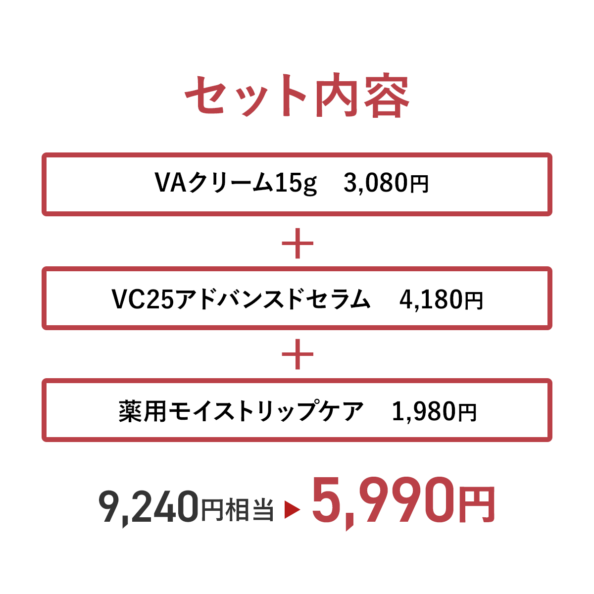 VAクリームとVC25アドバンスドセラムで、なめらかでハリ感のある印象へ整え、薬用モイストリップケアで仕上げまでしっとり。心までいたわるご褒美ケア3点セット。